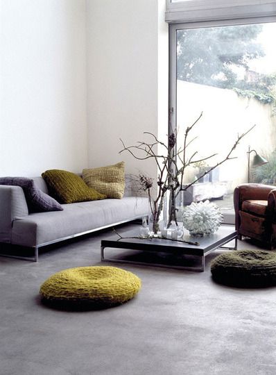 Zdá sa vám betón pre použitie v obývačke príliš chladný? Práve v tejto miestnosti máte množstvo možností ako jej vzhľad zútulniť a drsnosť betónu vyvážiť. Použite menšie koberčeky, množstvo dekoratívnych vankúšov alebo mäkké prikrývky.